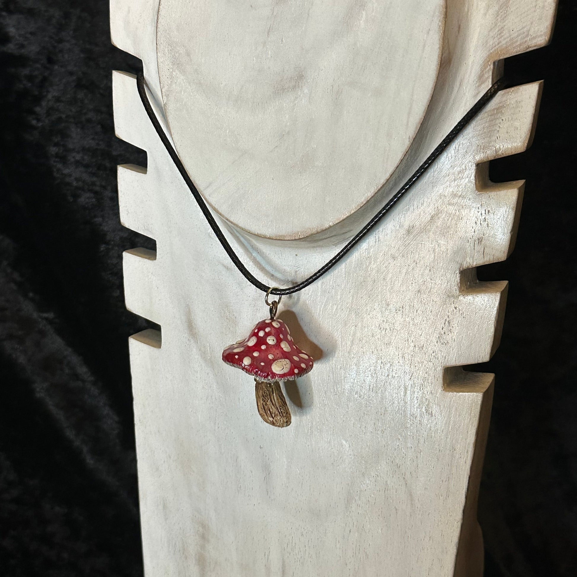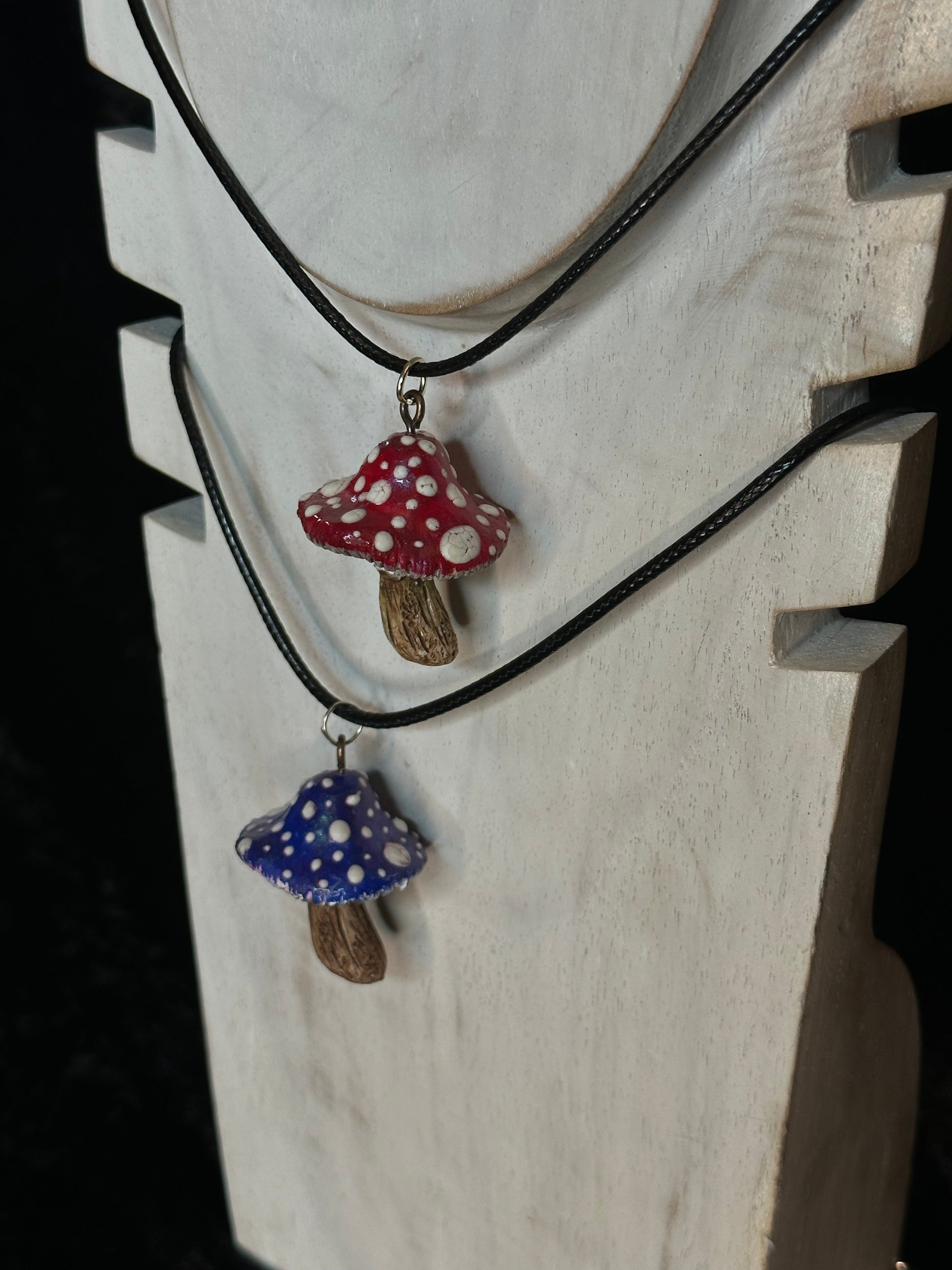 collares con setas artesanales talladas y pintadas a mano con detalles luminiscentes.