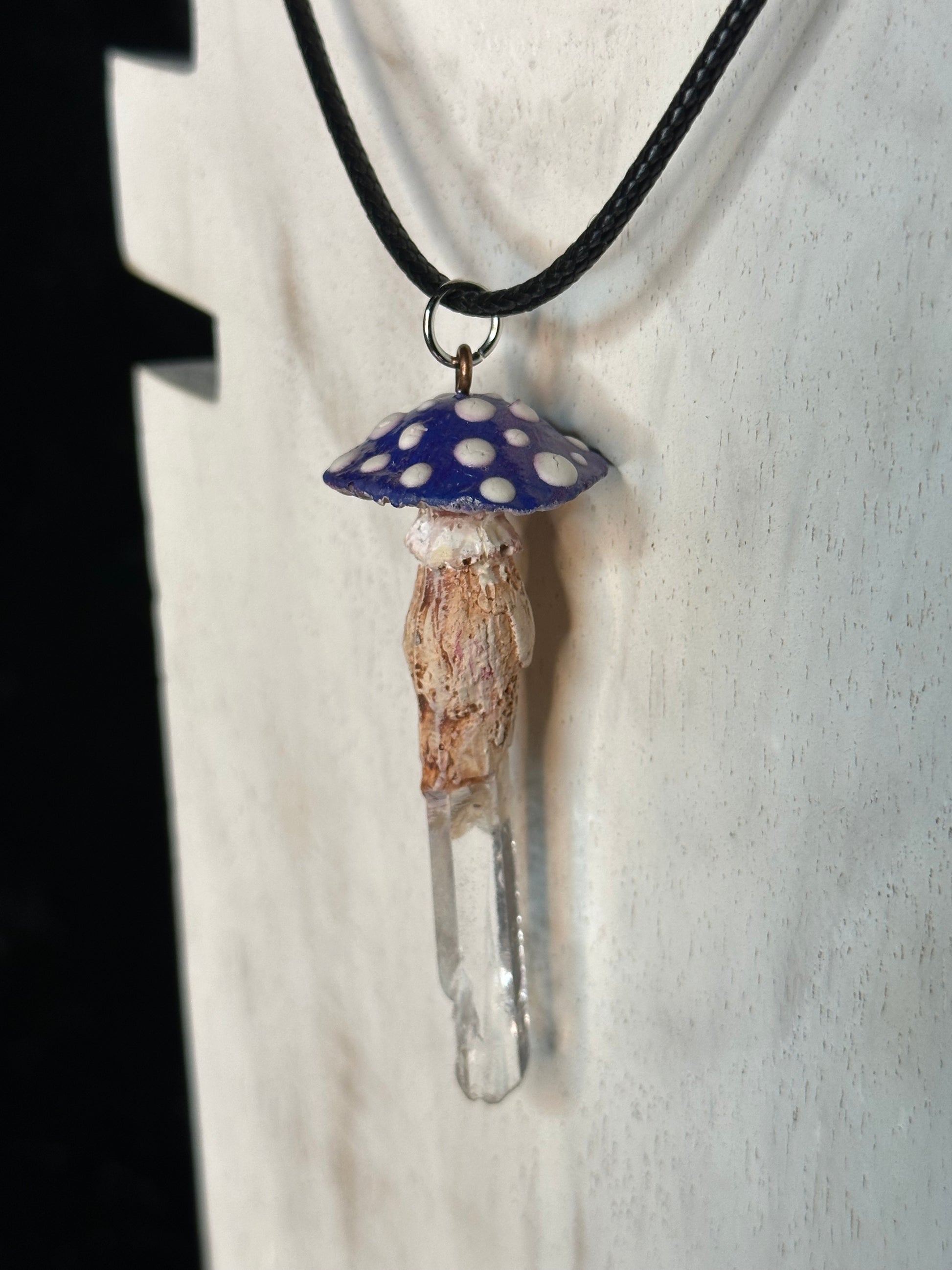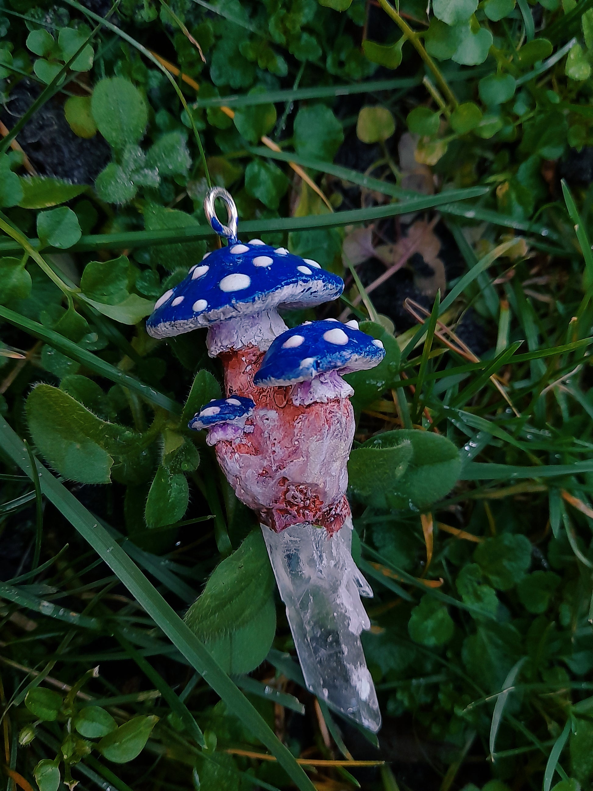 Cristales de cuarzo con setas artesanales talladas y pintadas a mano con detalles luminiscentes.